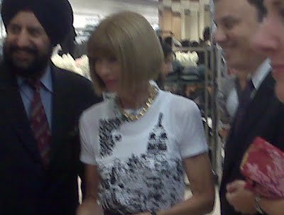 Last night was the First Annual Fashion's Night Out event in NYC. There were so many events going on that we didn't even know where to begin. The city was absolutely amazing! The weather was beautiful (surprisingly) and New Yorkers were actually being nice and cordial to each other. Live model window displays, celebrities, every designer you could think of, champagne, you name it! Cute outfit?? CHECK! Diddy??? CHECK! Anna Wintour??? CHECK! My camera??? FAIL! I could not believe it! It simply would not turn on. So there I was amongst all this fashion greatness and energy and couldn't document a damn thing! I even saw Anna Wintour smile!! How the hell am I ever supposed to prove that to anyone??? That's like a Big Foot sighting! I literally wanted to cry. Despite the tragedy, it still turned out to be a wonderful night. Next year I will make sure to have extra cameras on hand or an official photographer to follow me around.LOL In the meantime, check out the two blurry Blackberry pics I got of Ms. Wintour. SMDH!